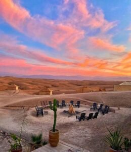 Experience the magic of the Agafay Desert as you ride a camel through its rolling dunes at sunset. Stop at a Berber camp to learn about the art of argan oil production and sip traditional Moroccan tea. As the sun sets, indulge in a delicious dinner of local specialties while enjoying live Berber music and mesmerizing performances around a crackling fire